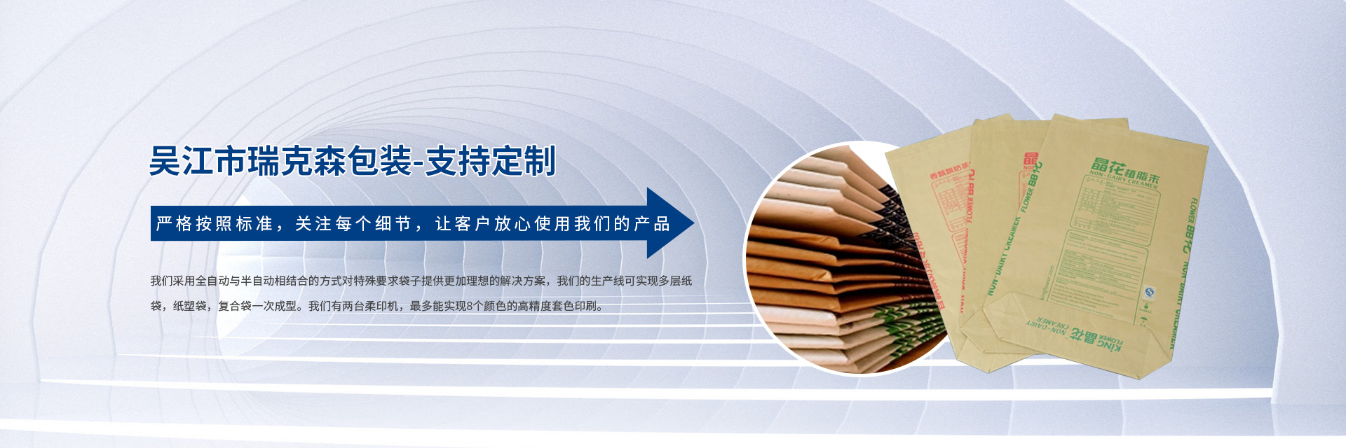 吳江市瑞克森包裝有限公司成立于2012年,坐落于蘇州太湖新城.我們主要為植脂末,奶粉,維生素等食品藥品企業(yè)提供包裝配套服務。瑞克森以安全,品質,環(huán)保,服務為經營理念,建立符合食品衛(wèi)生要求的制造環(huán)境,并通過QS食品包裝安全許可證,IOS9001質量體系認證。公司始終堅持采用優(yōu)質的原料跟生產工藝,生產的閥口袋,方底袋,熱封口袋,紙塑復合袋等完全能滿足全自動灌裝的要求。